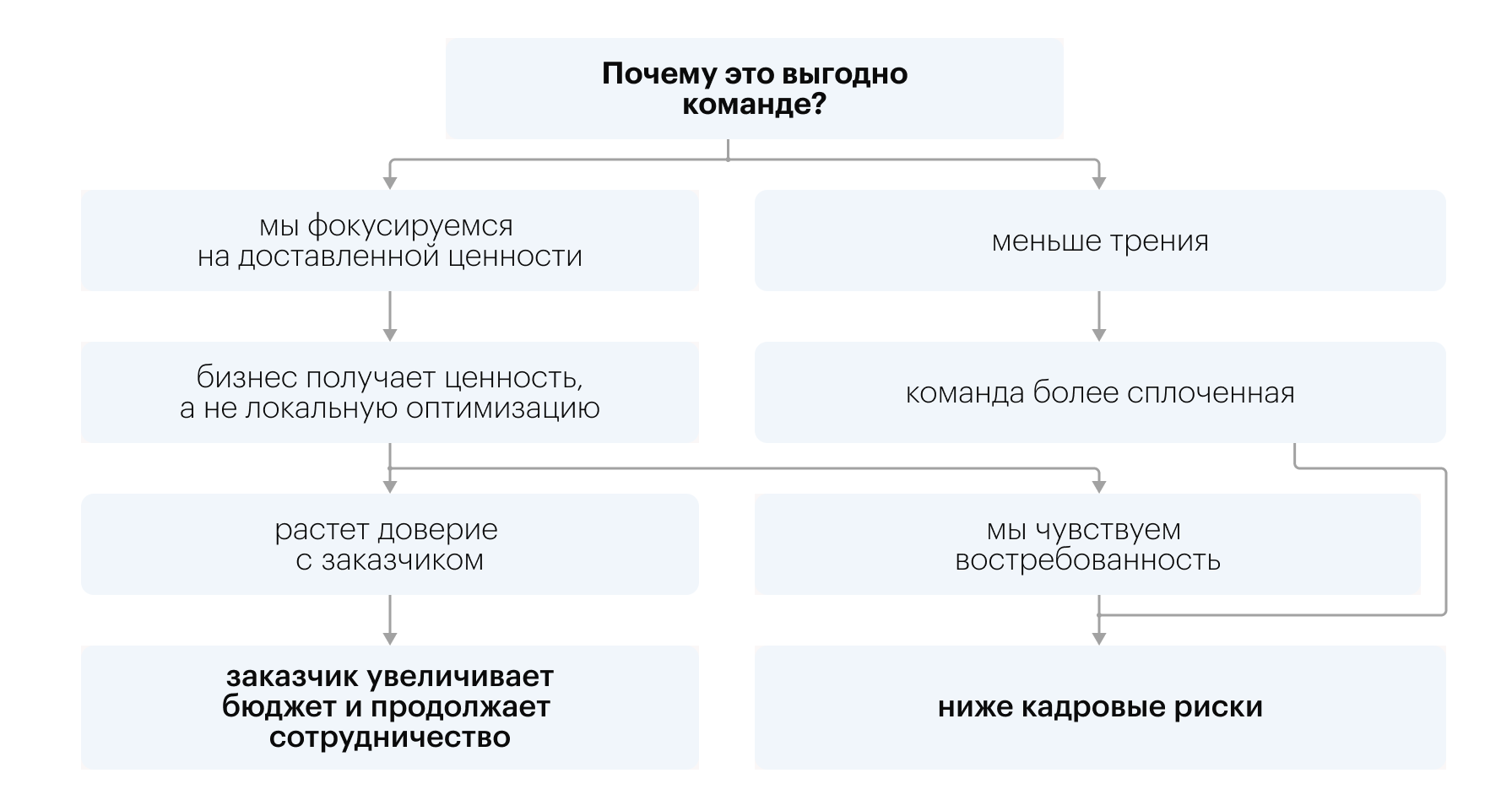 Почему это выгодно заказчику, я рассказал. Теперь о том, почему это выгодно нам как команде. Схема простая: