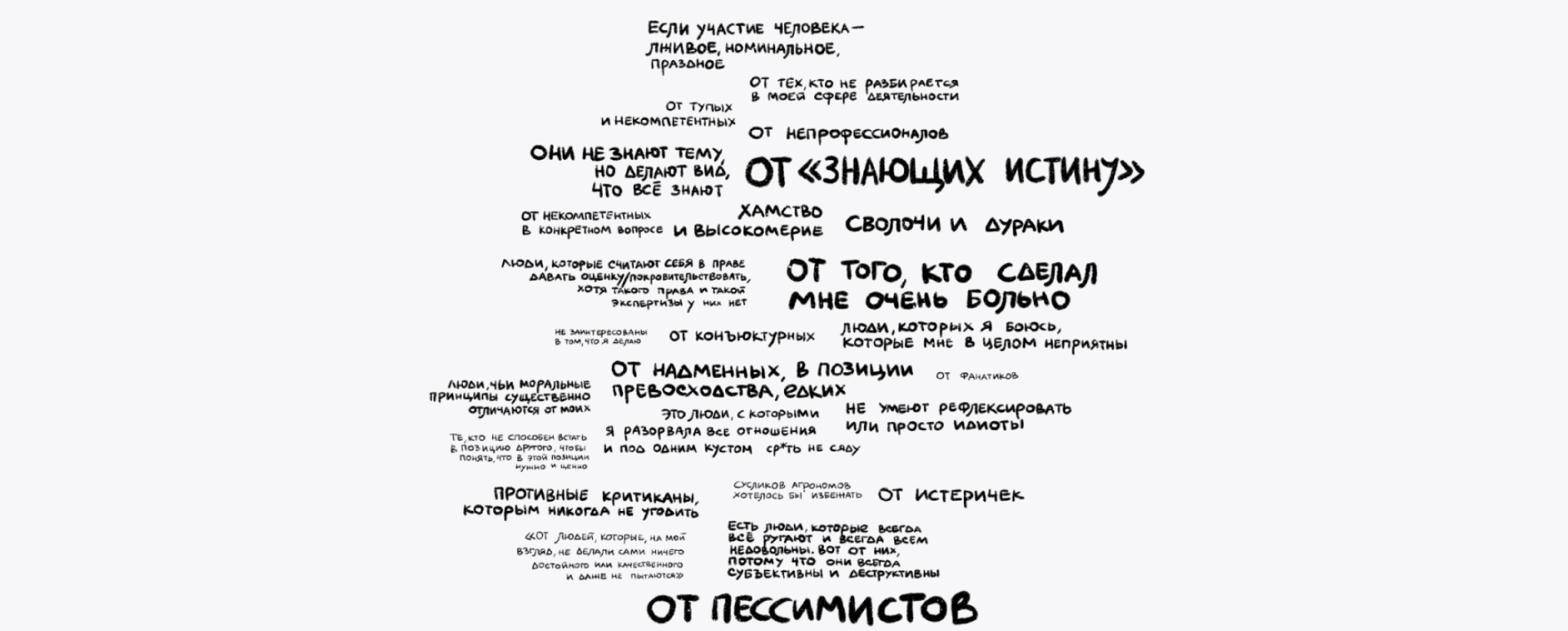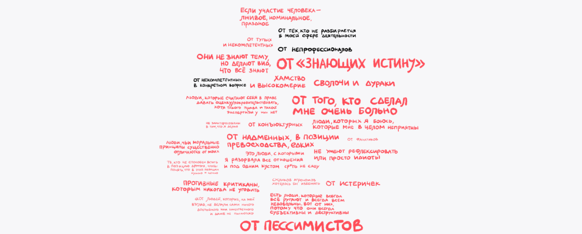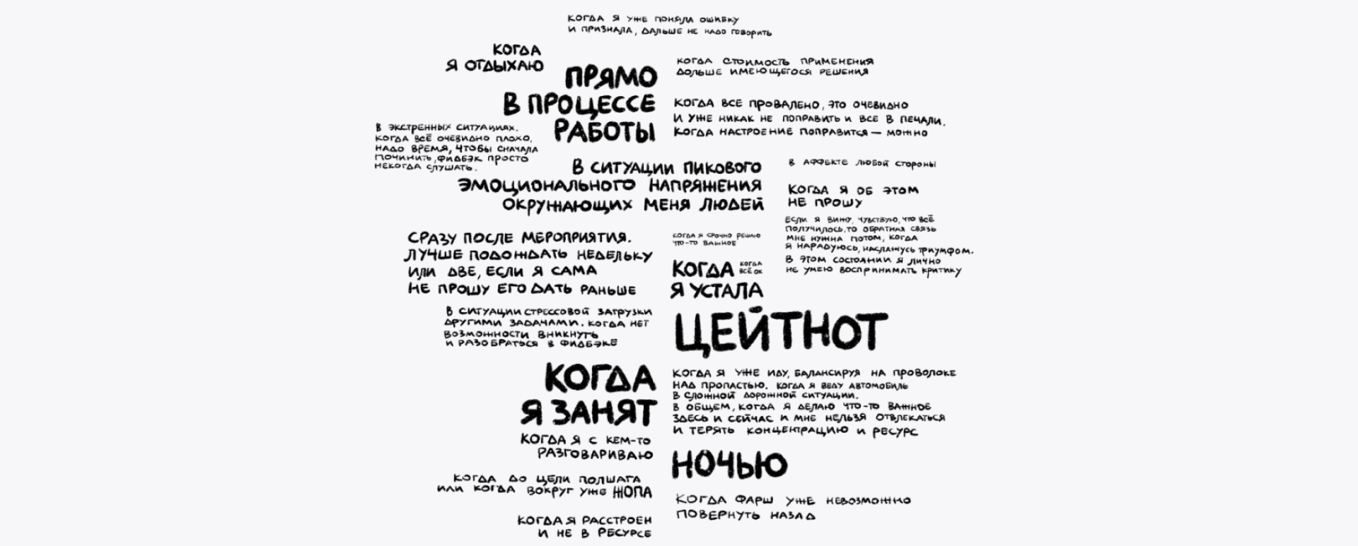 Люди говорят: «Не надо нам, пожалуйста, давать необъективную обратную связь. Без погружения, агрессивно, снобистски и по-дилетантски». Кстати, дилетантство — очень частое слово в ответах анкеты. Еще очень не хочется обратную связь не вовремя или в виде «всё унылое говно». Не хочется слов типа «норм» и «ок», если это вся обратная связь (я, кстати, так делаю).