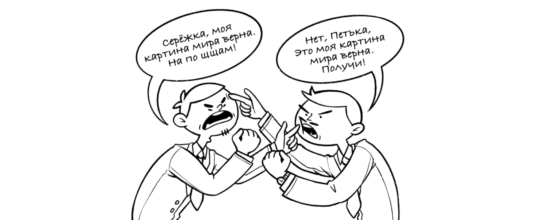 Если не рассматривать случаи, когда у вас разные цели или религиозно разные мнения про путь к общей цели, то после того, как вы уберете расхождения в картинах мира, все у вас будет хорошо. Вы станете одним коллективным субъектом и будете дальше друга друга понимать с полуслова. Собственно, это целевое состояние команды — когда люди могут думать друг другом, расшаривать мышление на соседа.