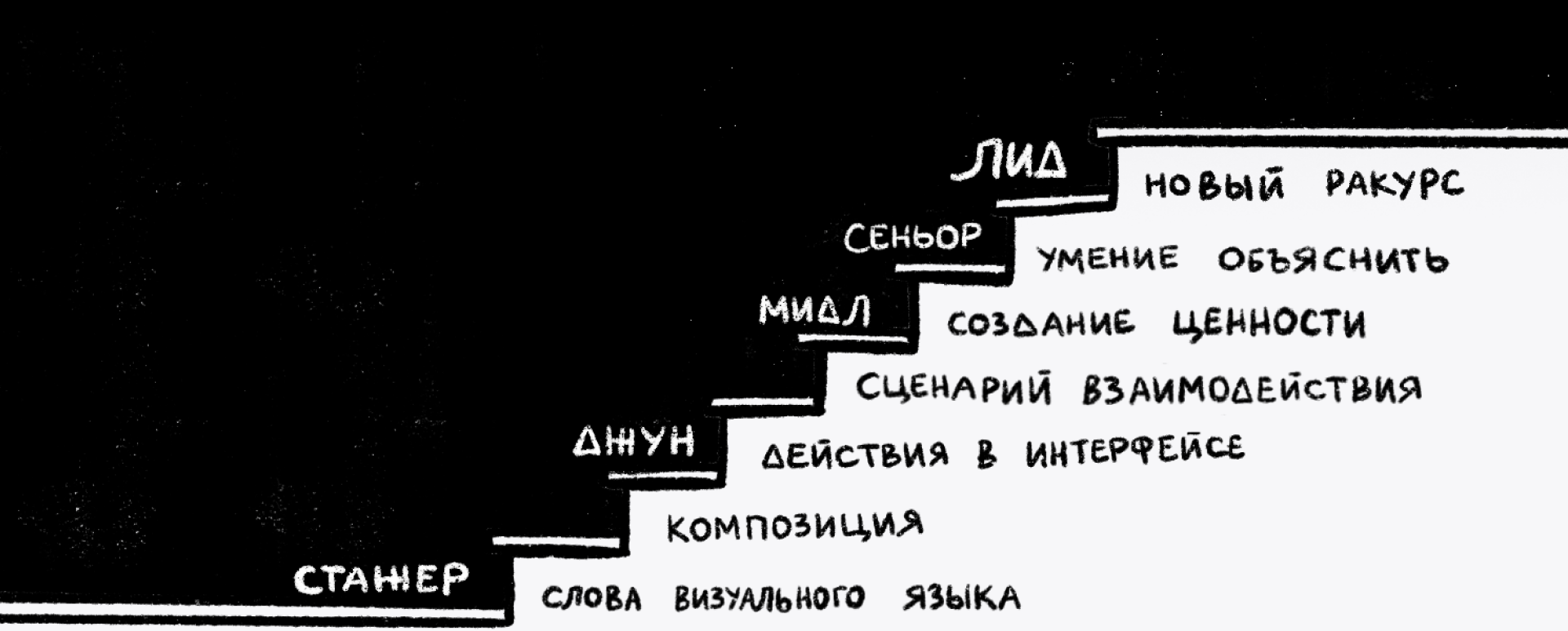 «Все же не так, как я понял. То, как я понимал дизайн, это только часть. Дизайн на этом уровне не заканчивается. Есть и другие взгляды на дизайн». Например, когда-то я научился делать дизайн полиграфический. А потом узнал, что бывает же еще дизайн интерфейсов, там опять все по-другому. Я научился дизайну интерфейсов, а потом обнаружил, что нет — это же был просто дизайн лэйаута, а ведь есть дизайн пользовательских сценариев. Можно продолжать бесконечно: дальше дизайн бизнес-моделей, процессов и оргструктур, и это уже другие профессии. В общем, за время карьеры вы по этой лесенке пройдете несколько раз. Для первого прохода надо 3–4 года обычно.