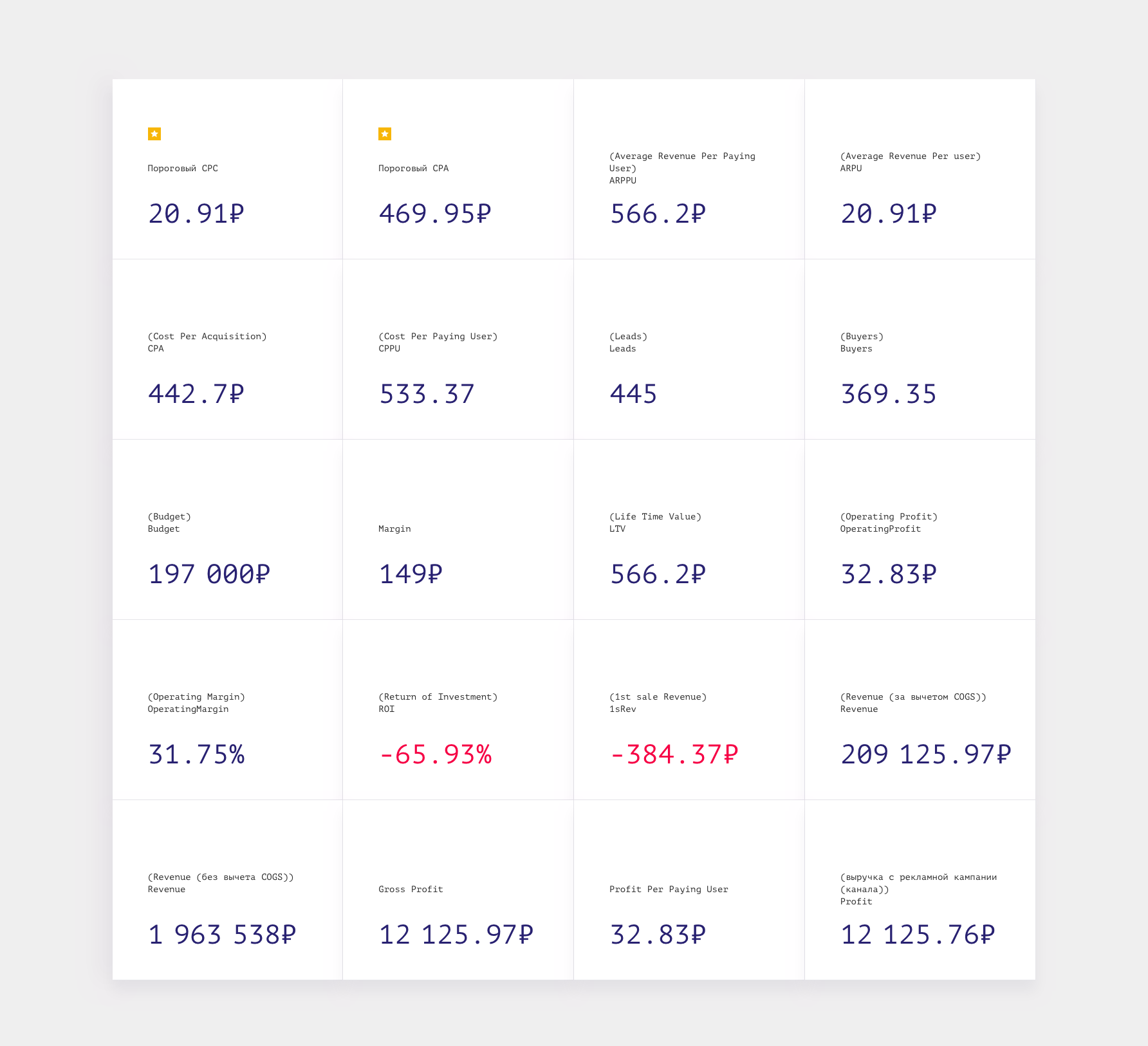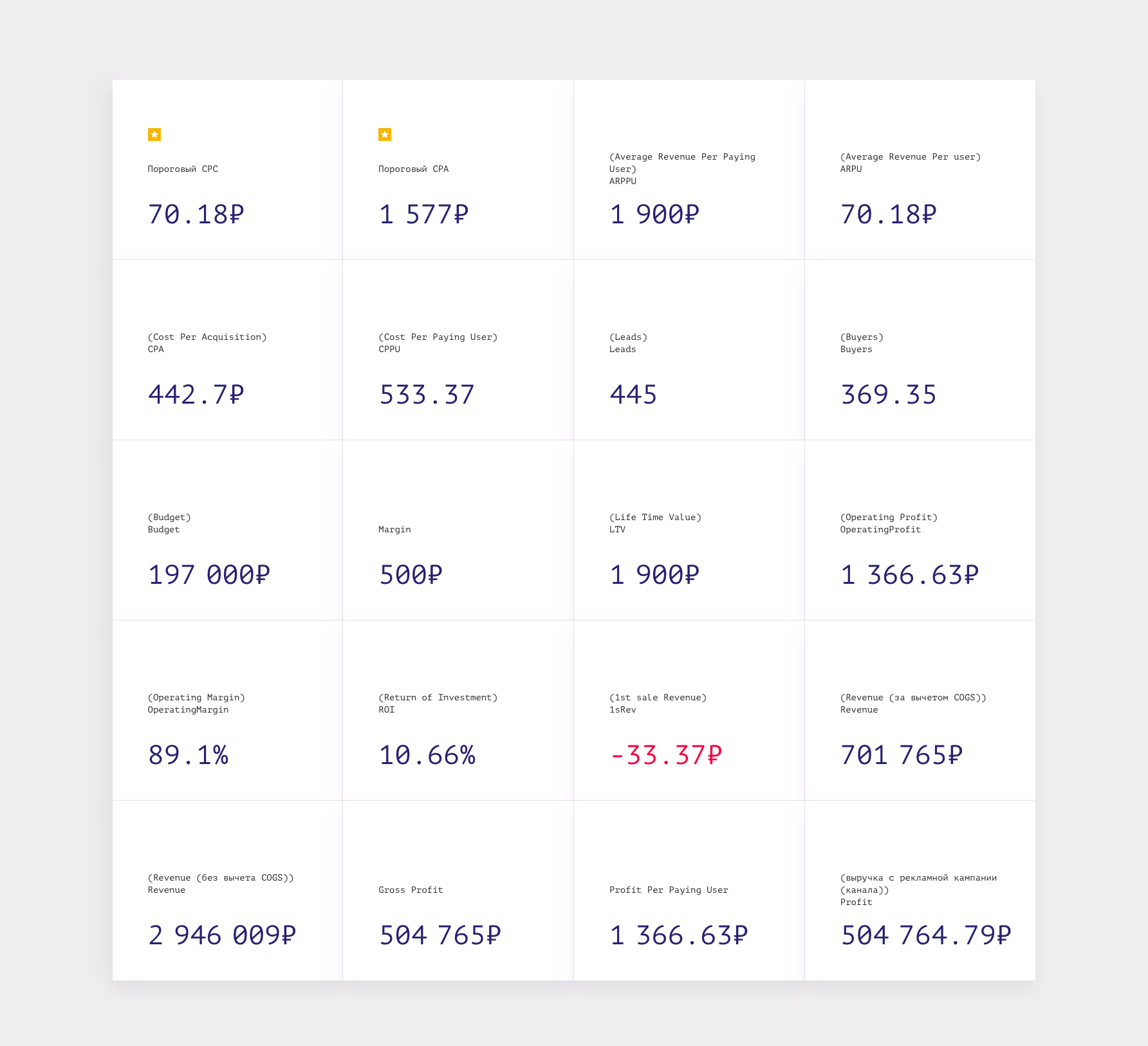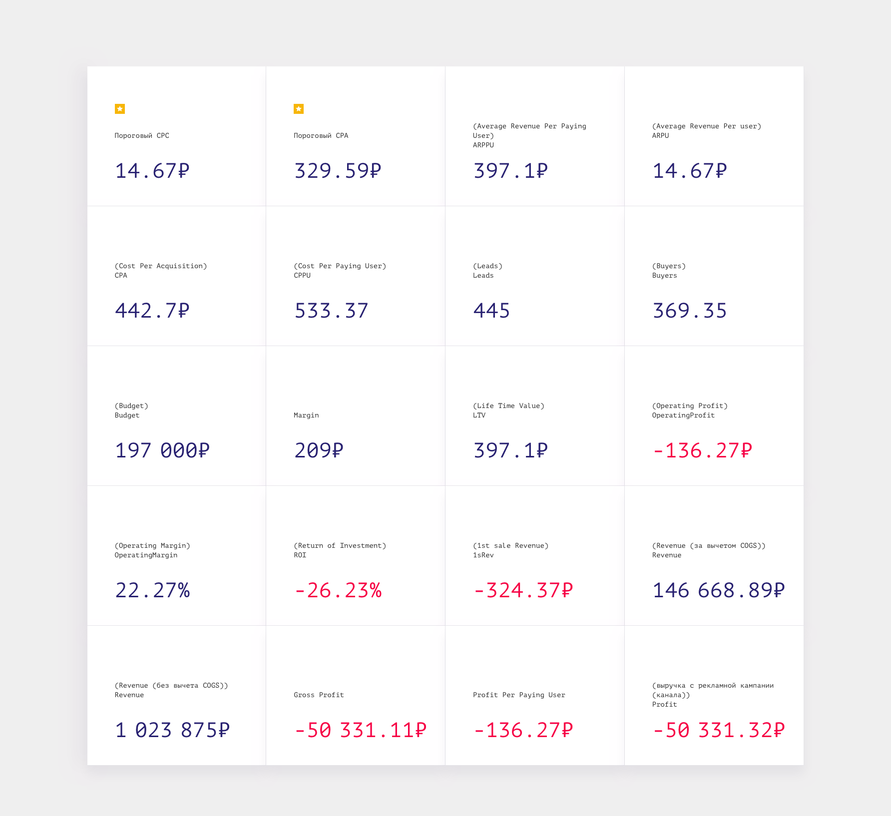 По итогу мы понимаем, сколько вообще можно заработать, а главное, насколько наша модель чувствительна к колебаниям. Например, если шаг в полпроцентных пункта конверсии выносит вас из окупаемости, вы можете позволить только очень и очень контролируемые по цене каналы и вам ультраважно отслеживать любые изменения в конверсионной воронке. Или наоборот: когда вы торгуете высокомаржинальным товаром, не стоит ограничивать себя в удельно дорогих инструментах. Становится понятно, когда и стоит ли вообще инвестировать в разработку или редизайн сайта или приложения. А иногда выясняется, что разрабатывать нужно не фронт-, а бек-интерфейсы, потому что источник инновации в поднятии маржи за счёт удешевления процесса.
