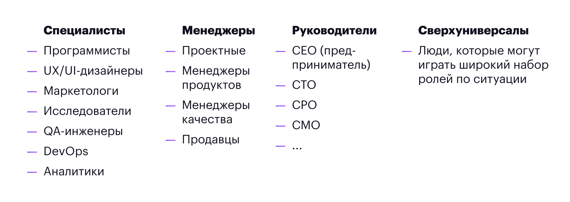 Если вы хотите узнать подробности про отдельные роли: кто за что отвечает, что лучше всего умеет и чем интересным занимается — скачивайте мою презентацию. В ней я разобрал роли инвестора, предпринимателя/CEO, руководителя разработки, продакта, проджект-менеджера, разработчика, DevOps, UX-инженера/дизайнера, QA, исследователя и маркетолога.