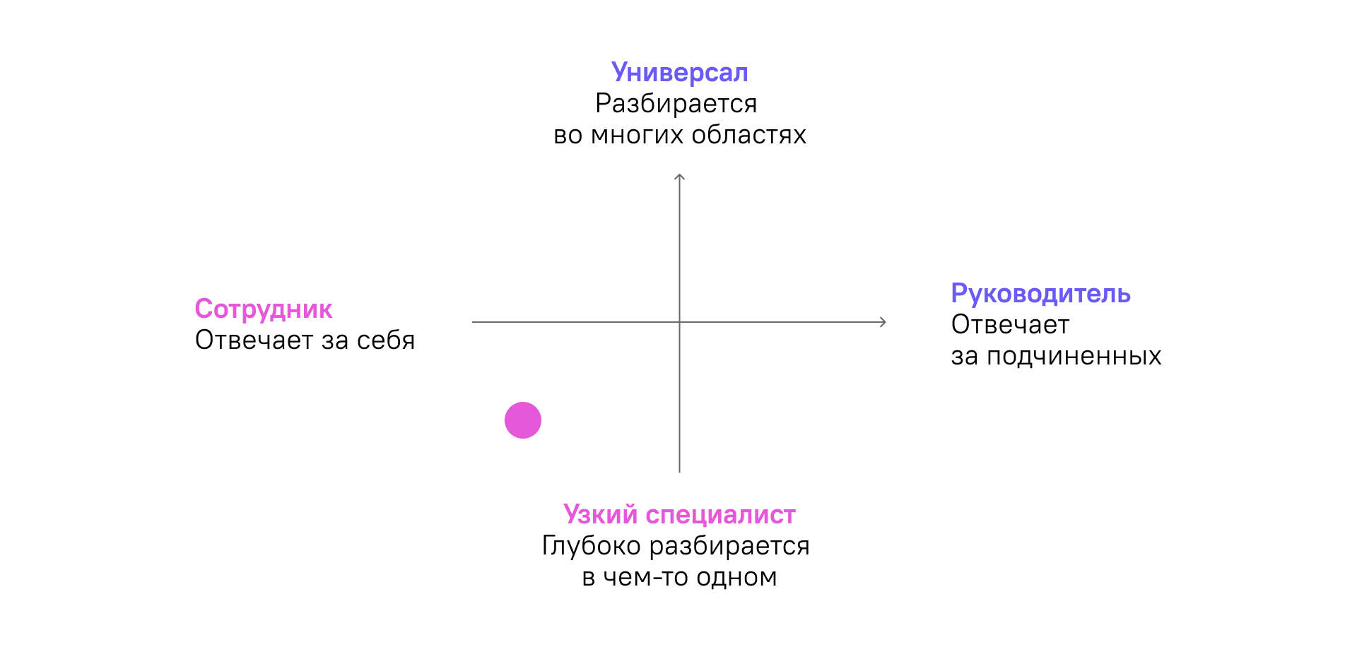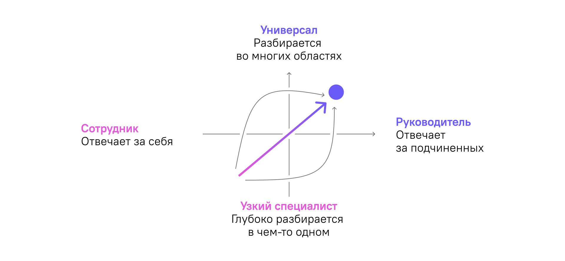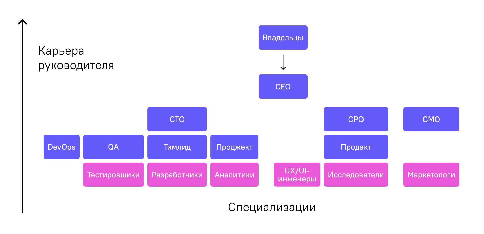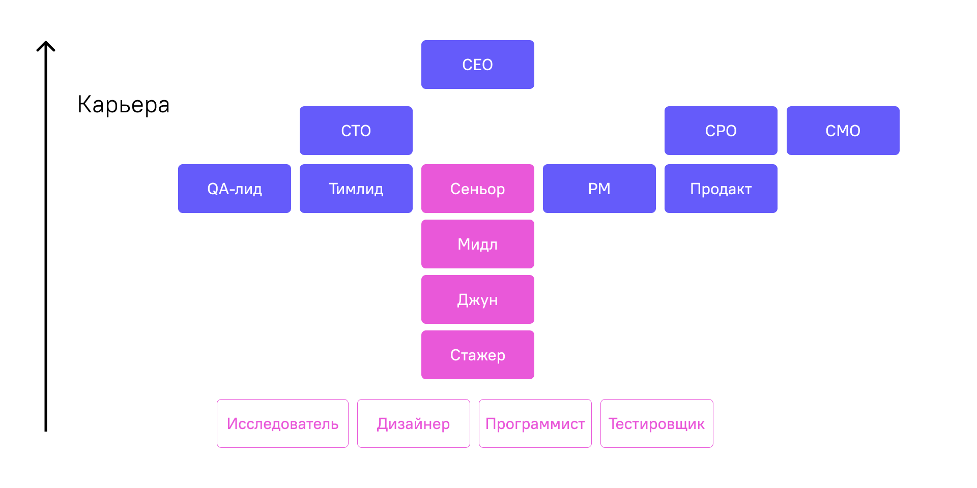Розовые на схеме — это места, которые можно занимать, оставаясь специалистом. А синие — это роли с большим объемом ответственности, которые можно получить, если пойти выше по лесенке.