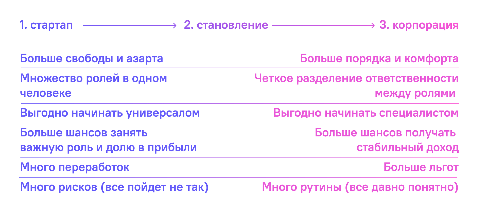 В корпорациях есть позиции для узких специалистов и заранее понятно, что делать. В стартапах команда зачастую состоит человек из четырех, поэтому все делают всё, и быть узким специалистом сложно. А еще стажерских вакансий в стартапах обычно нет — для этого в компании должен быть свободный сеньор, который готов стажеров выращивать.